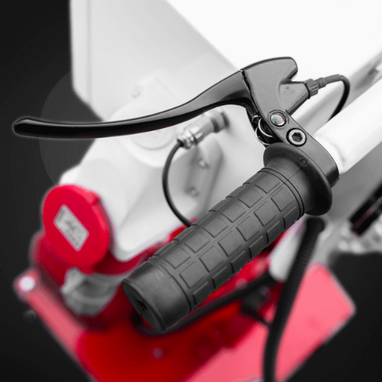 Czerwony grzybek STOP, przycisk startu oraz manetka bezpieczeństwa, która musi być wciśnięta podczas pracy, gwarantują pełne bezpieczeństwo. Zwolnienie manetki natychmiast wyłącza urządzenie.
