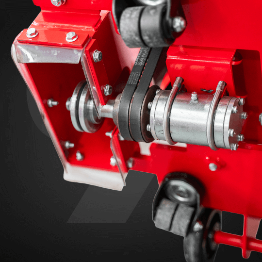 Napęd realizowany jest przez dwa paski klinowe, które w razie nadmiernego nacisku zaczynają się ślizgać, zamiast pękać. Operator od razu czuje przeciążenie i chroni maszynę przed uszkodzeniem.