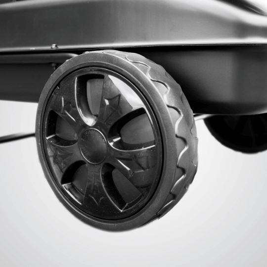Wytrzymałe koła i uchwyt transportowy ułatwiają przemieszczanie urządzenia nawet po nierównym terenie.