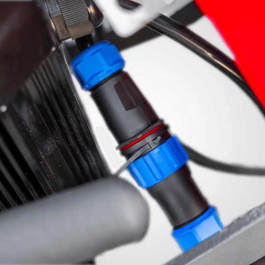 Szybkozłącze z uszczelnieniem chroni instalację elektryczną przed wilgocią i ułatwia serwisowanie oraz demontaż.