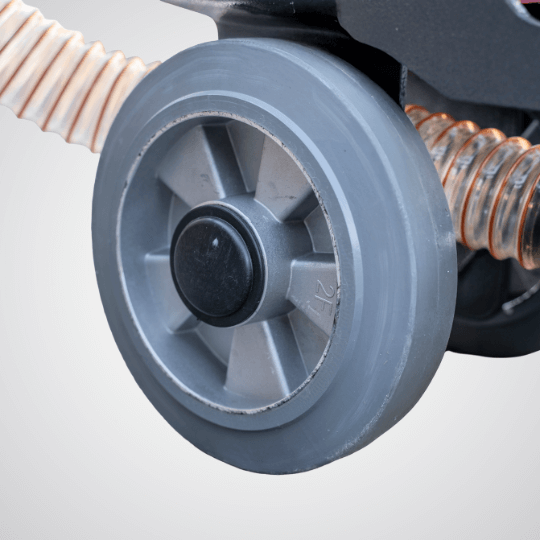 Duże, wytrzymałe koła umożliwiają łatwe przetaczanie szlifierki nawet po nierównym podłożu.